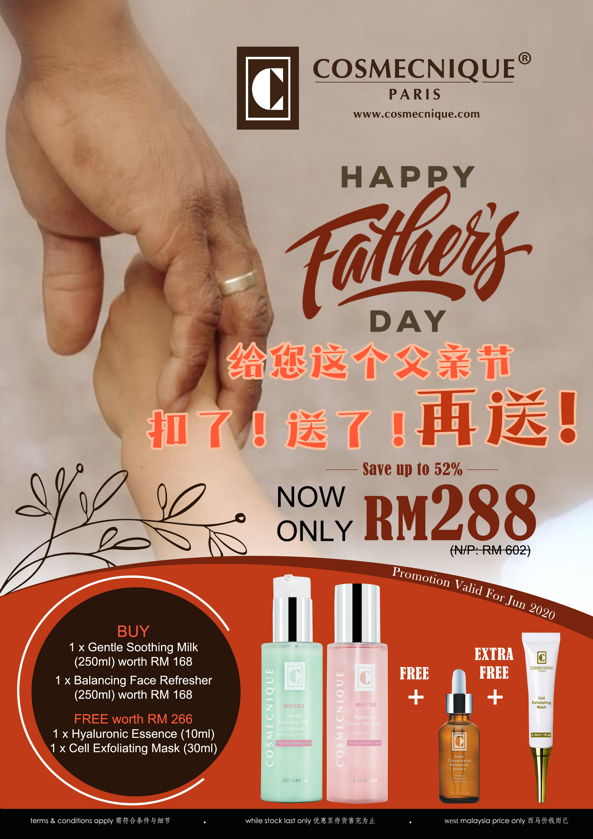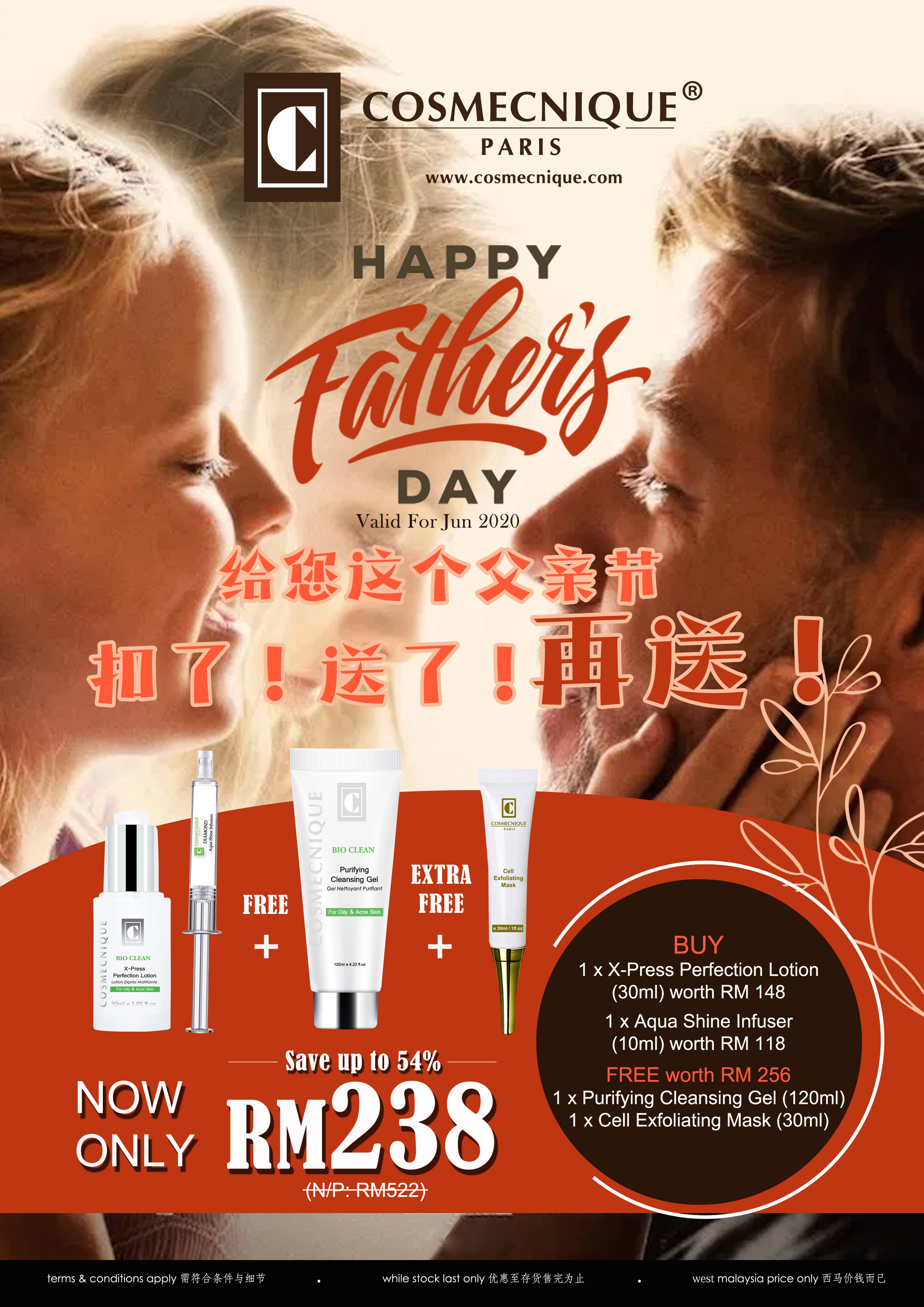 每月促销父亲节优惠 [六月份]cosmecnique6月 12, 20206月 12, 2020 建议皮肤-【暗沉皮肤】 建议皮肤-【油性皮肤】 建议皮肤-【老化皮肤】 【试用套装】 买上RM280 即送一支细胞去角质霜